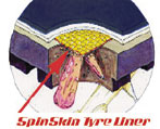 SpinSkinsレース自転車タイヤライナーのタイトに織り上げた高強度繊維の接触面に 力を分散させることでインナーチューブのピンチフラット抵抗(蛇噛み)を倍増させる ことができます。これは積雪した雪道を歩く時に履くかんじき(スノーブーツ)で